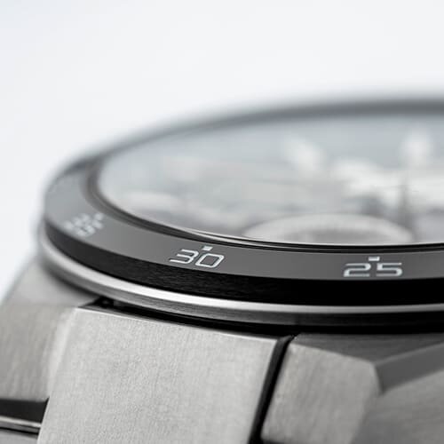 Míg a kerámia lünetta (balra) széles felső kialakítású, a titán lünetta (jobbra) felső része sokkal keskenyebb és élesebben lejtett, ami könnyedebb megjelenést eredményez, ami jól illik a titán tok eleganciájához.