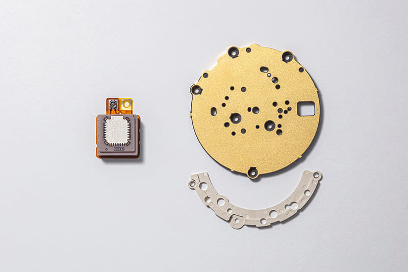 Az SSH159 számlap három rétege. A bal oldali, poliészter és akril kompozit anyagból készült reflektorlemez az alap, amelyre a számlaprész (középen) és a gyűrű alakú rész (jobbra) kerül elhelyezésre. A függőleges, csíkos struktúra mélyen benyomódik a számlap felületébe, amely áttetsző bevonatot kapott a hátlapon, így egy masszív, fémszerű textúrát kapunk.