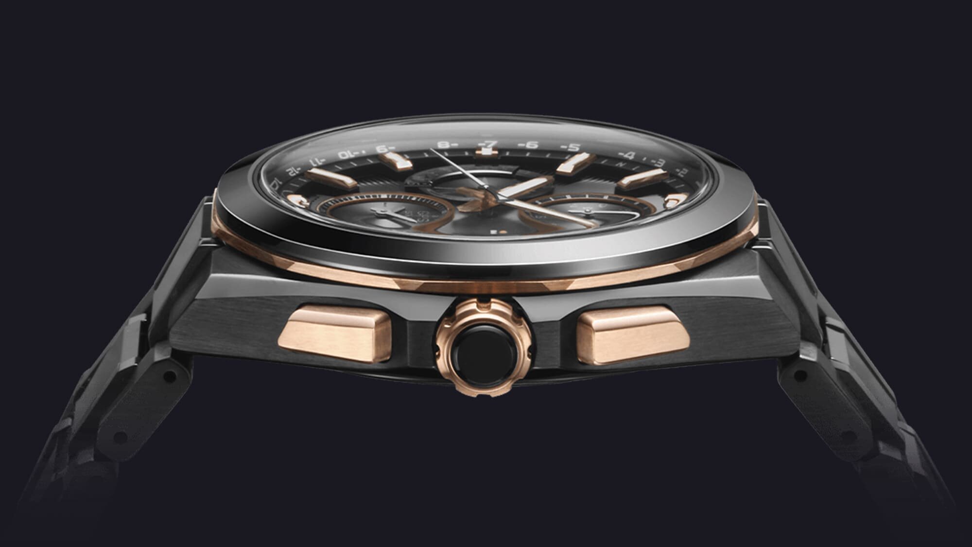 A rosegold elemeknek ezzel nincs vége, a nyomógombok, a korona és a számlap főbb elemei is így készültek, elegáns kontrasztot adva a fekete modellnek.