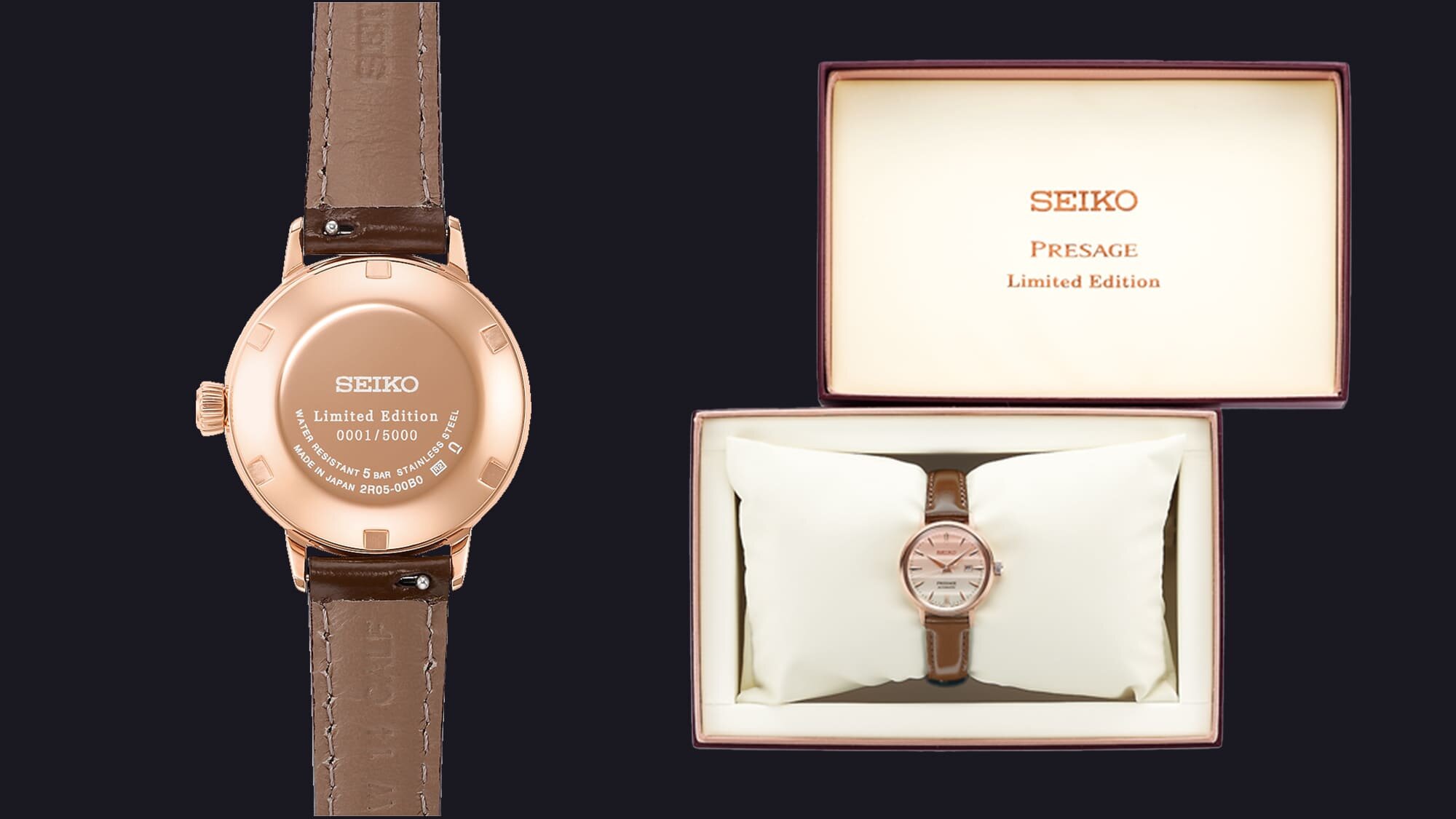 Ahogy a másik új modell, az SRPE014J1 is a nemesacél tokhoz borjúbőr szíjat kapott, és 5000 darabos limitált kiadásként saját, egyedi díszdobozt is.