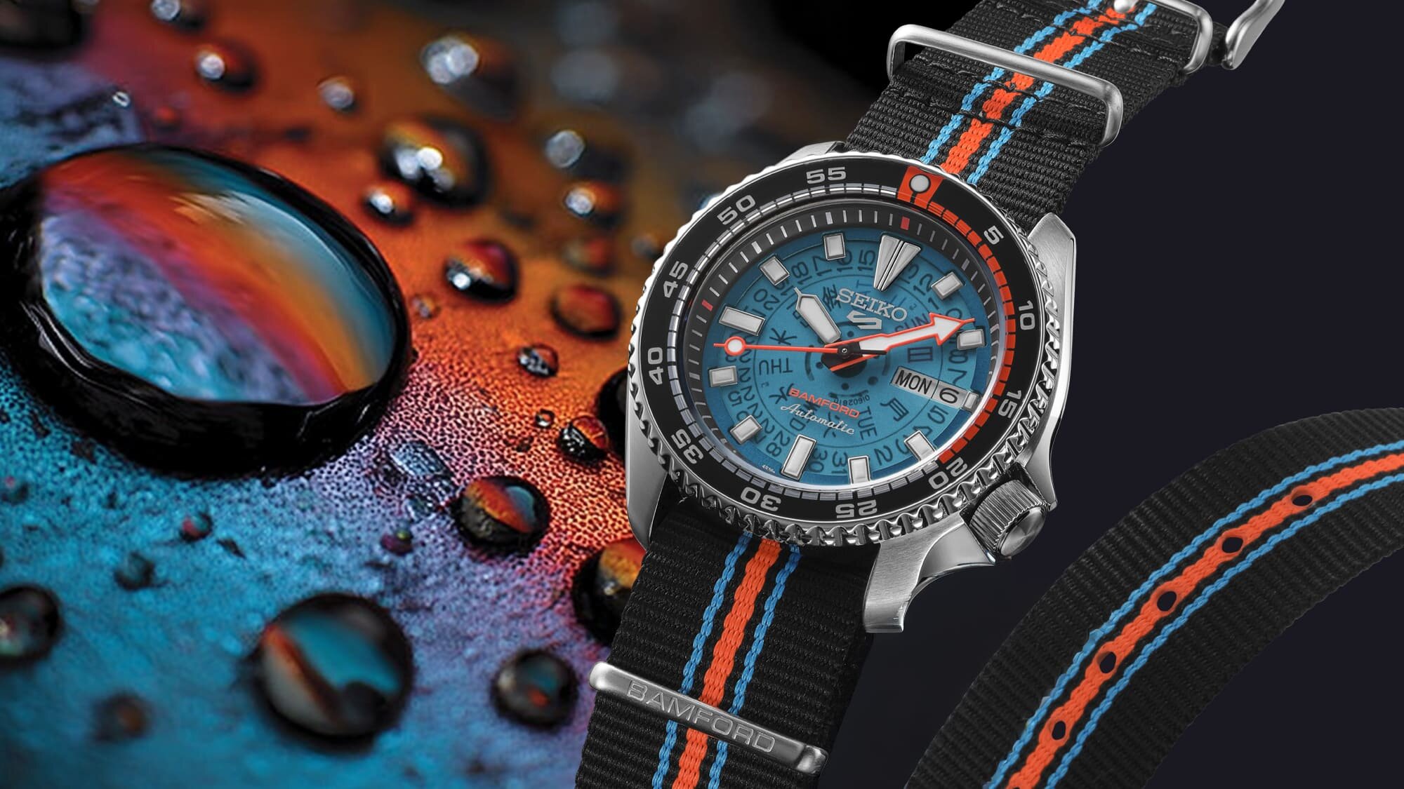 A foszforeszkáló bevonatok, színek és anyagok kiemelt jelentőségűek ennél a modellnél, hiszen sötétben és UV fény hatására az indexek és mutatók mellett a belső percosztás egyes elemei, a Bamford neve a számlapon, a búvárlünetta beosztása 20 percig is foszforeszkál, de a legkülönlegesebb mind közül a Nato stílusú szíj, amelynek a közepén végigfutó narancs sáv is szinte világít a sötétben - egy különleges kollab, különleges megoldásokkal.