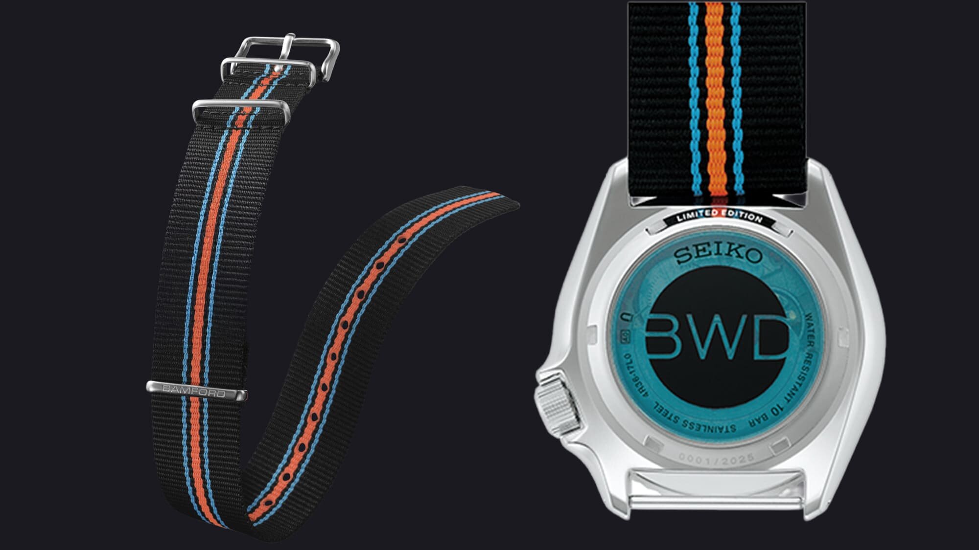 A Bamford az óra minden részén megjelenik, a menetes, üvegbetétes hátlap üvegére festve is megtaláljuk, itt a “BWD” kerek logója kapott helyet, alatta a limitált kiadás sorszámával 1 és 2025 között, ennyi példányban készült ugyanis mindössze ez a darab, amely világszerte a Seiko Boutique üzleteiben lesz csak elérhető, várhatóan 2025 októberében.
