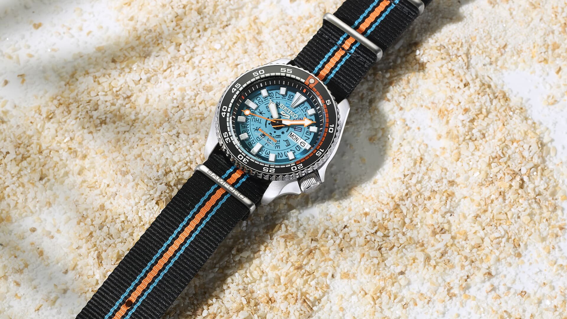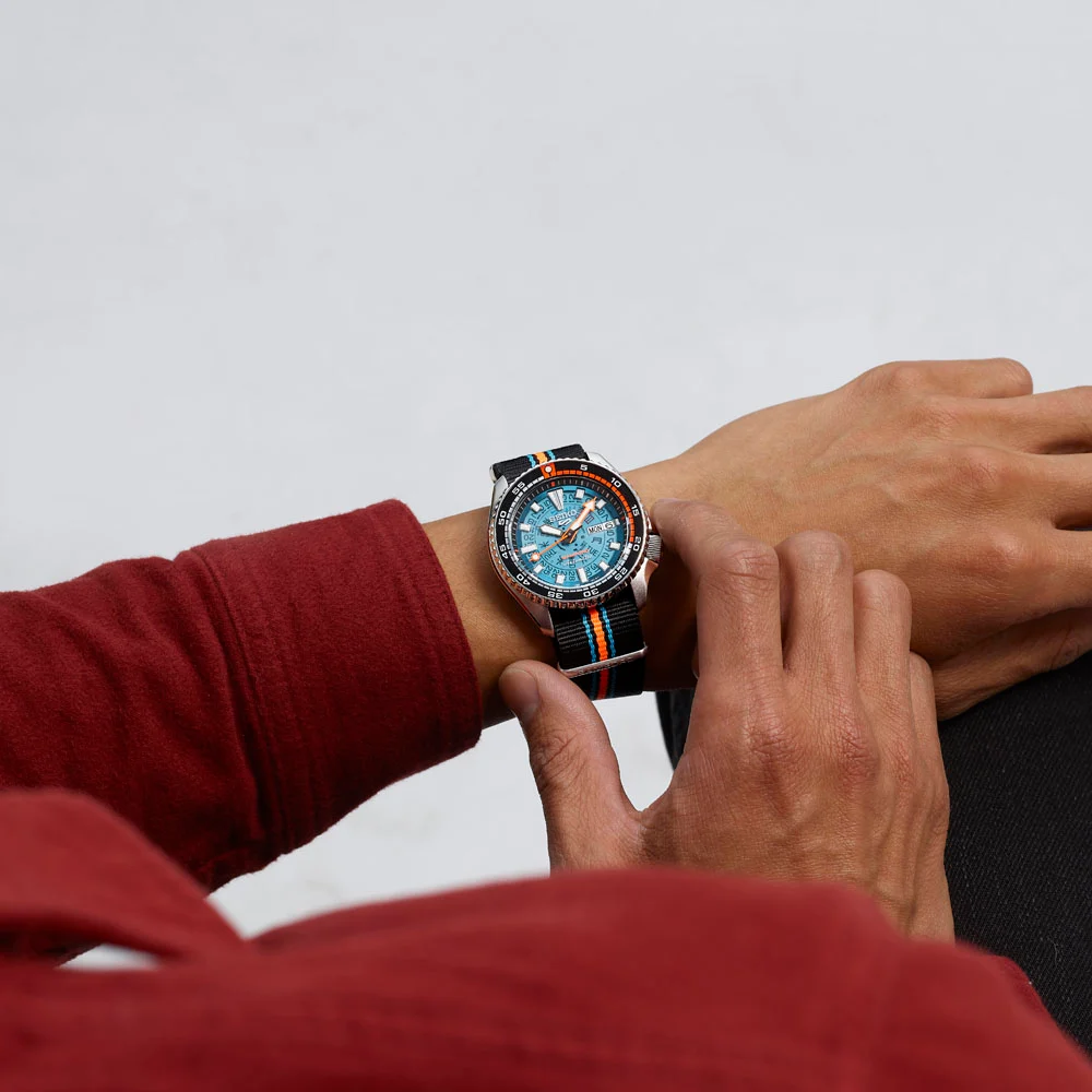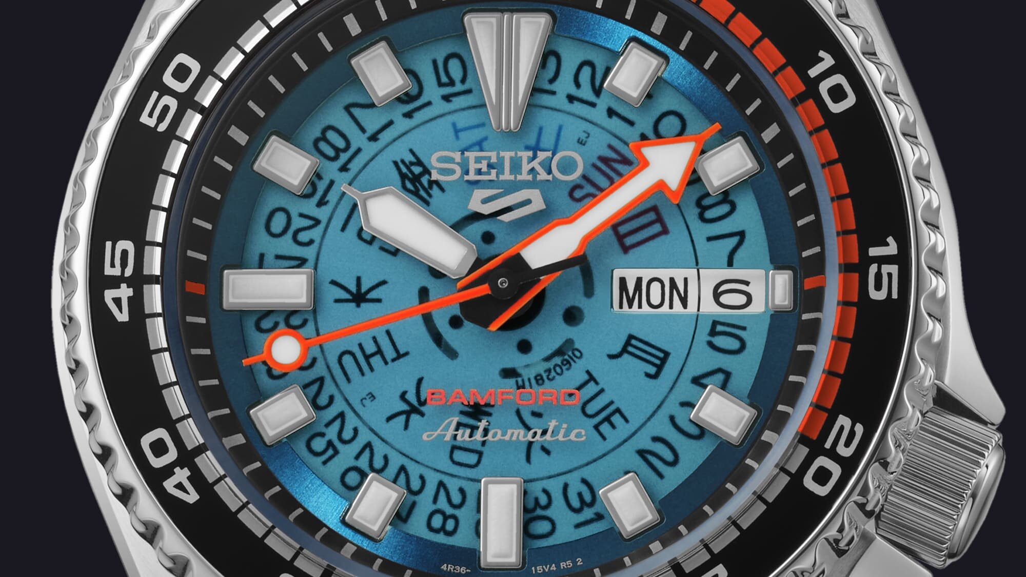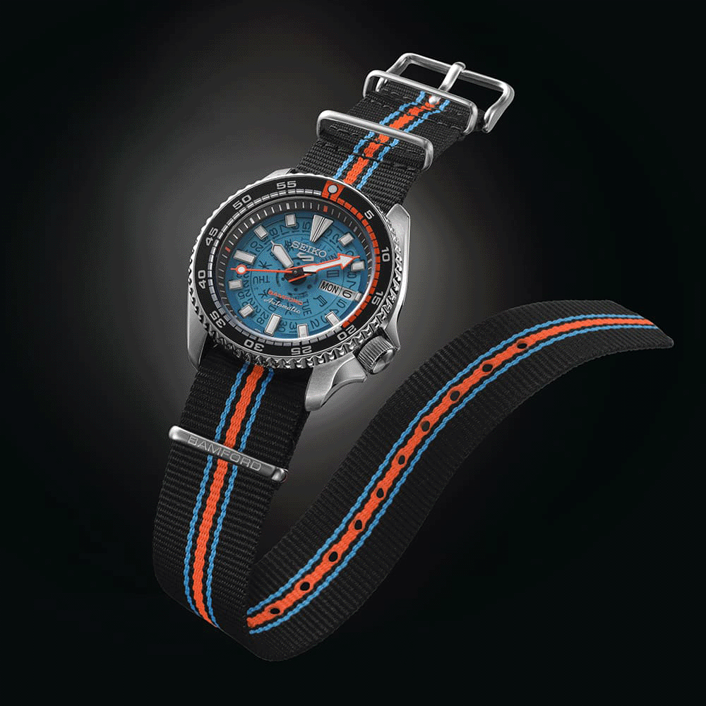Szintén helyet kapott rajta a Seiko 5 logo 12 óránál, a klasszikus “Automatic” felirat hat óránál, és ugyanitt a “Retro Future” stílus jegyében neon narancssárga színben a Bamford logója is.