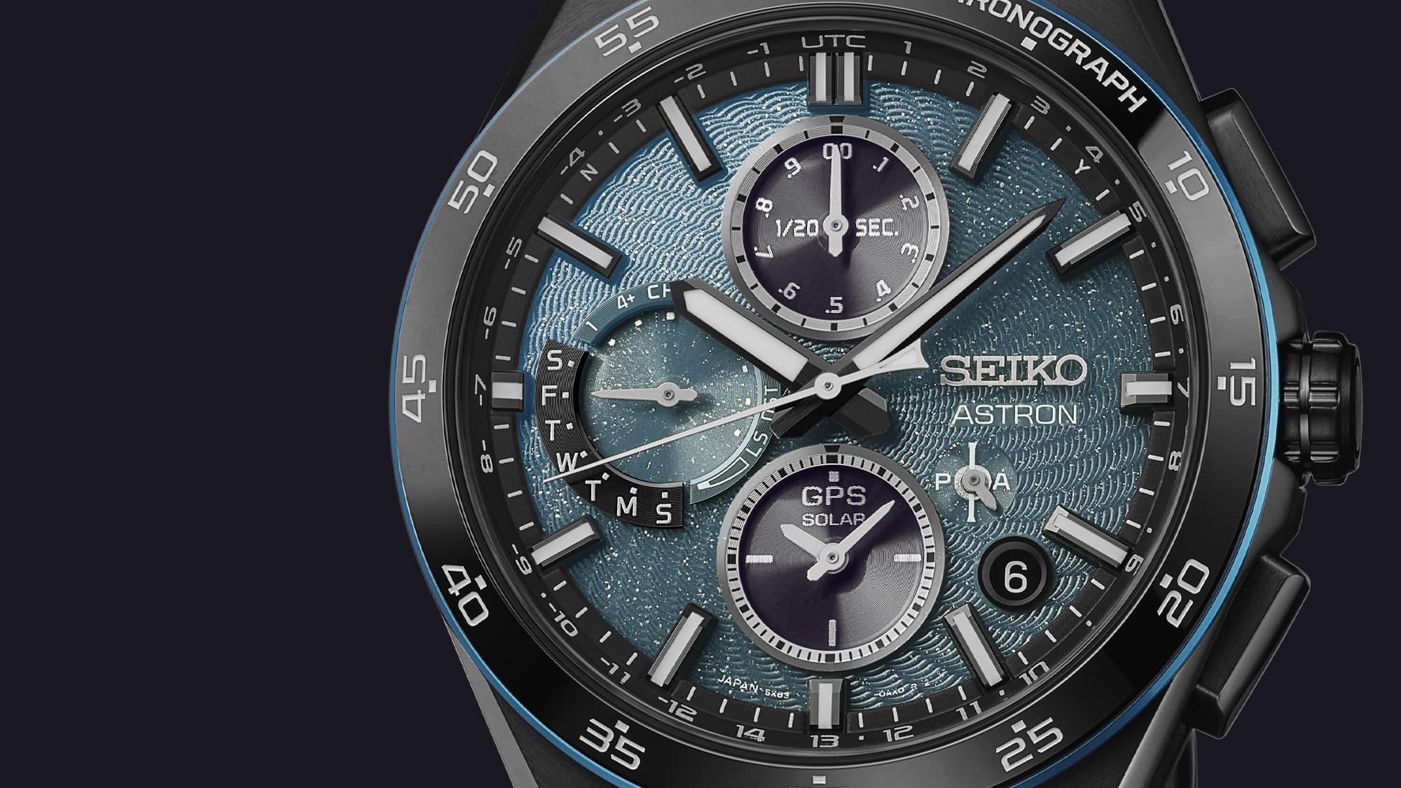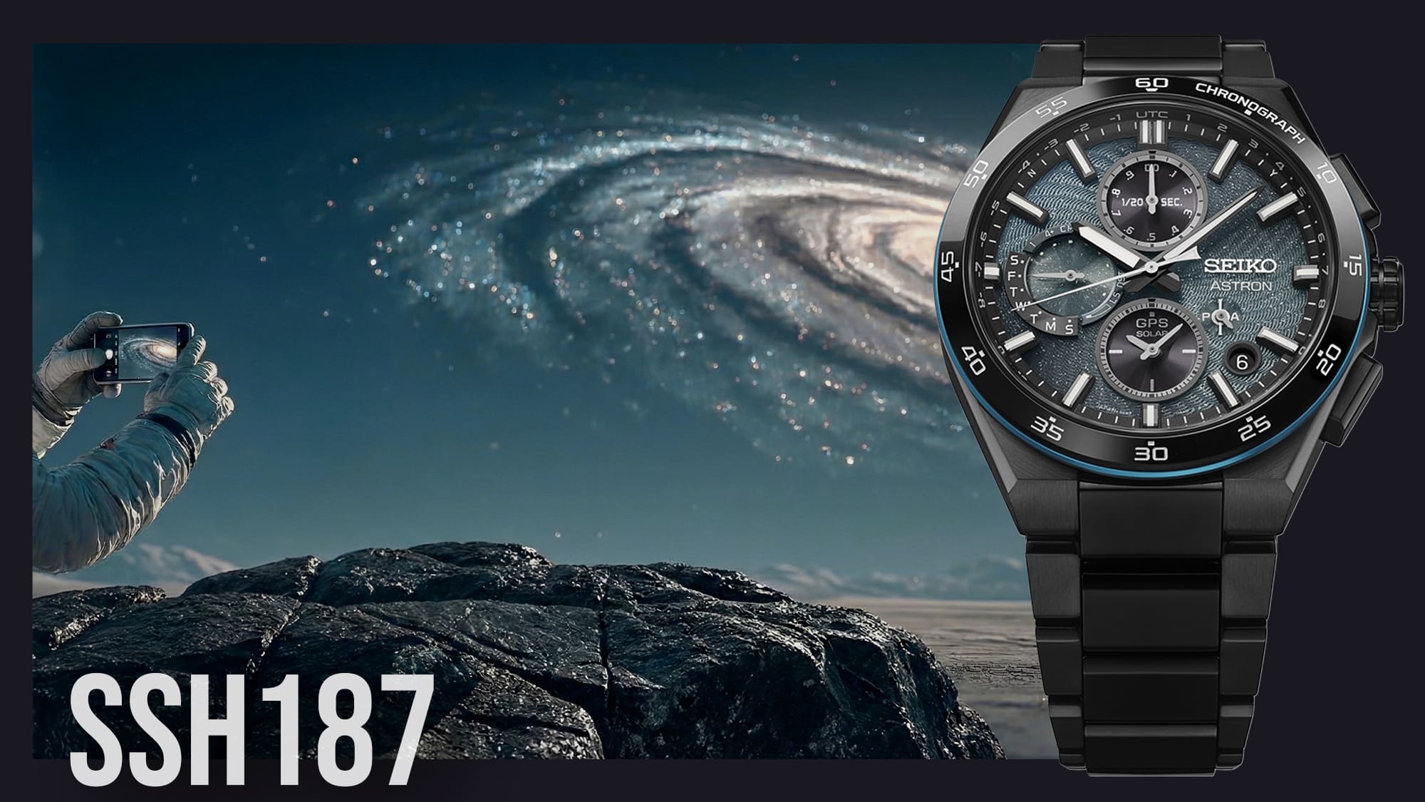 Az új kalibernek köszönhetően a korábban megszokott Astron számlapok megjelenése is változott, így az SSH187J1 is a klasszikus kronográf segédszámlap elhelyezéssel készült: 6, 9 és 12 óránál találjuk a különböző funkciók kijelzéseit.