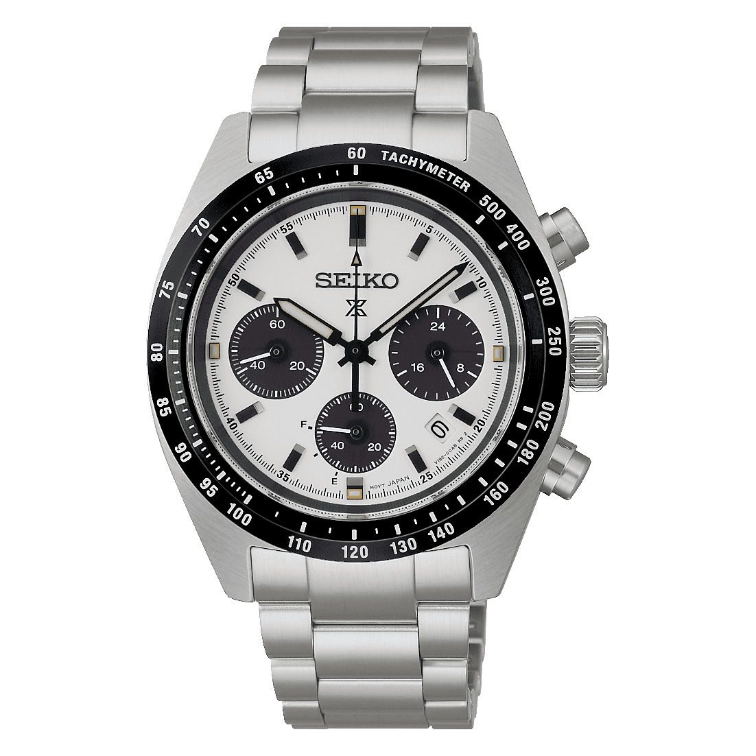 Az SSC691P1 modell a klasszikus “Panda” stílusában, a fehér számlapon a fekete segédszámlapokkal ismerős lehet, és ez nem véletlen. A Speedtimer Solar Chronograph sorozatot megalapozó modell ezzel a cikkszámmal tért vissza, és továbbra is minden bizonnyal a legnépszerűbb színösszeállítás lesz a sorozatban. A nemesacél tok és fémszíj a fekete fém lünettával sportos megjelenést ad az órának, a tachiméter skála pedig (amely átlagsebesség mérésében segít) jól illik az autósportok világába.