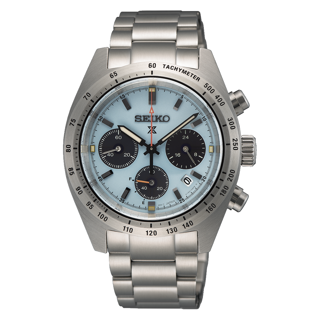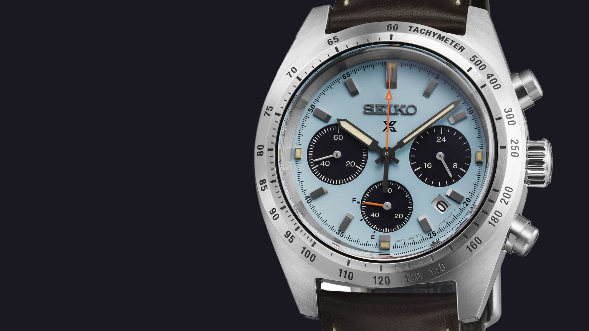 A világoskék számlap, az ezüst indexek és a narancs mutatók együtt a motorsport ikonjait hozzák el, a V192 solar kvarc kronográf szerkezet pedig éppen ehhez a stílushoz illik a legjobban.
