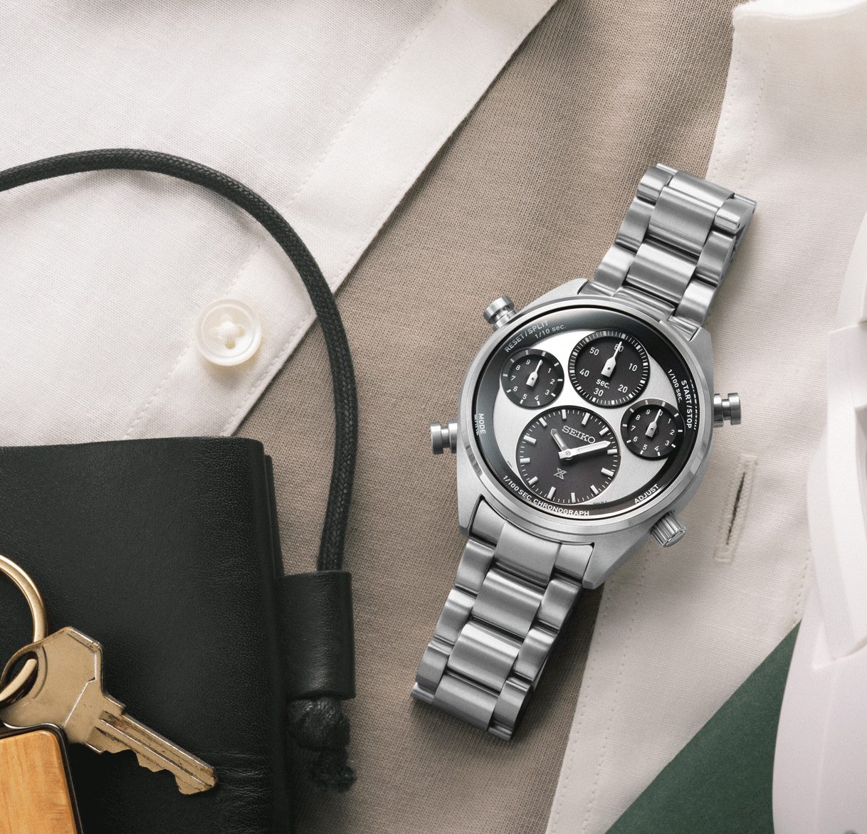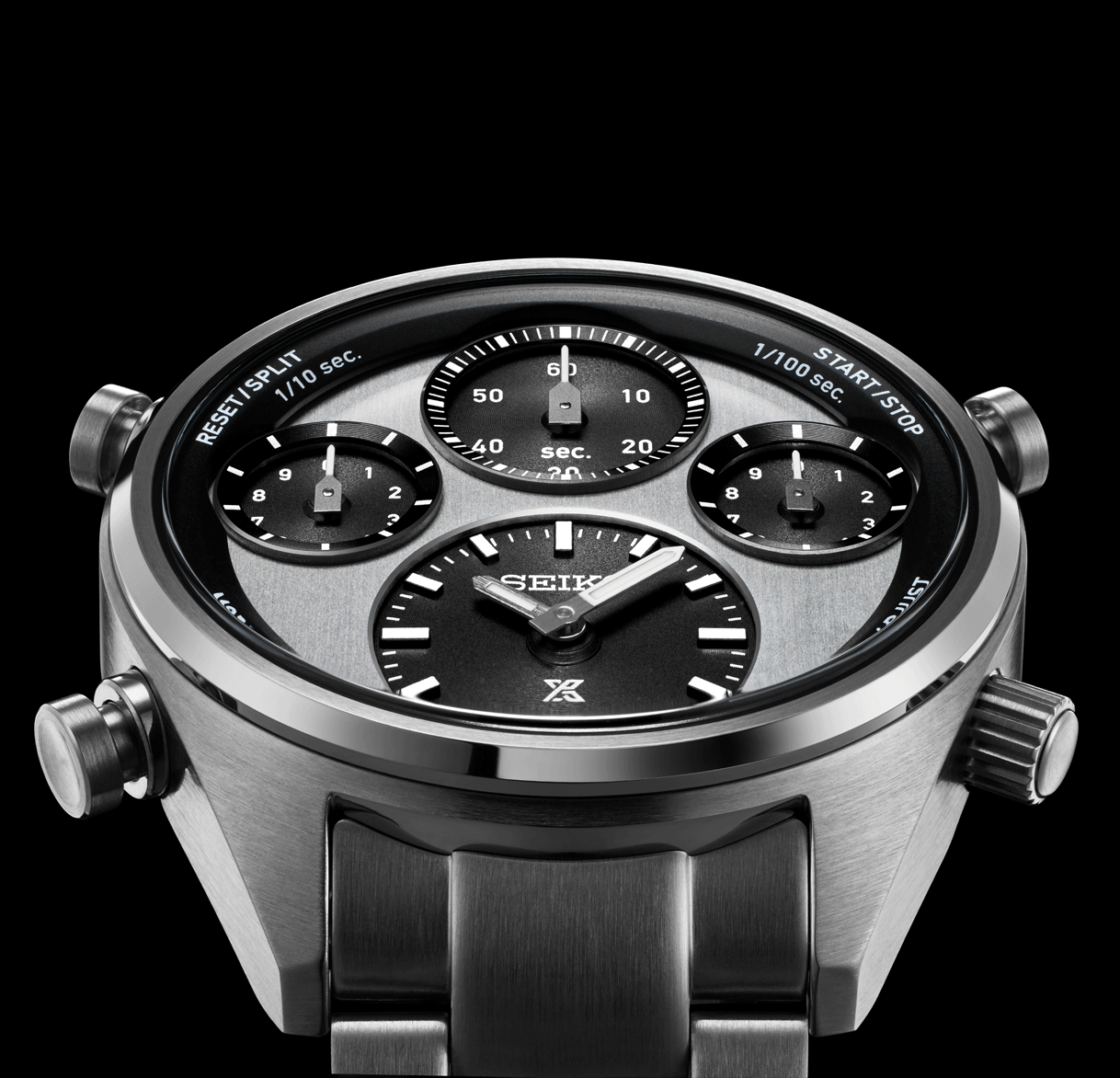 Az új Prospex Speedtimer SFJ001P1 modellhez egy új kaliber jelenik meg 8A50 névvel. A nevében minden benne van, amit tudni kell és tudni érdemes róla - 1/100 solar chronograph. Az 1/100 jelentése a századmásodperc pontosságú időmérés, amely analóg, mutatóval történő kijelzés esetén igen magas érték, összehasonlításképp egy átlagos kronográf ⅕ másodperces pontossággal mér, az 1/100-as érték ennek a hússzorosa - finomabban, precízebben, kifinomultabban. A solar kronográf egy kvarc kaliber, amely energiaellátását a fény biztosítja, ezt alakítja át elektromos energiává és tárolja a működtetéséhez akár hat hónapon át. A működéséhez szüksége solar panelek a számlapok alatt helyezkednek el, a mai technológia már annyira hatékony, hogy minimális fény is elég a töltöttség fenntartásához. A design bármennyire is modern, korábbi sikeres Seiko modellekből merít, a négy külön számlapra osztott “multi dial” megjelenés egy kultikus Seiko modell, a Kinetic Chronograph stílusa mai formába öntve. A négy számlapon külön-külön elhelyezett mutatók közül alul, hat óránál találjuk a legnagyobbat, ez a hagyományos időmérésé. A másik három számlap a sportidőmérésé, 12 óránál számolja a másodperceket, 10 óránál a tizedek és 2 óránál a századmásodperceket - rendkívül látványos, ahogy ez a századmásodperces mutató szinte repül körbe, amíg a stopper funkciót használjuk. Az SFJ001P1 fekete-fehér (vagy ahogy az órák világában nevezik, a Panda) színben érkezik