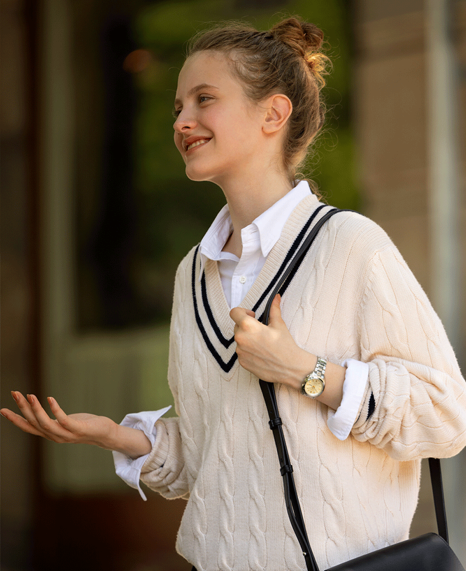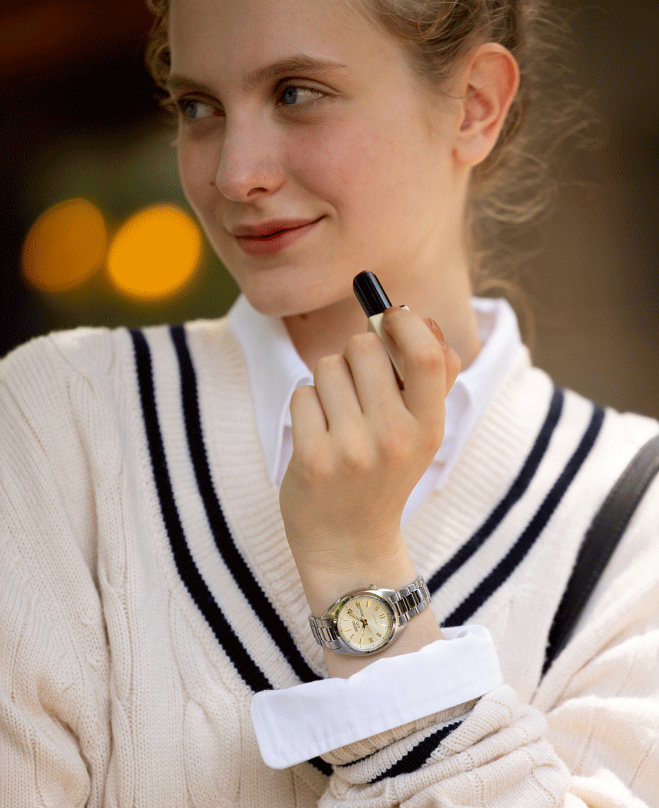 A Seiko 5 Sports SNXS sorozat a kollekció sportos, mégis visszafogottan elegáns vonalát képviseli. Olyan modellcsalád, amely megőrzi a Seiko 5 alapértékeit, ugyanakkor finomabb arányokkal és sajátos karakterrel jelenik meg. A 32 mm-es átmérőjű női modellekhez 11,4 mm-es vastagság és 38,7 mm-es tokmagasság társul. ezek az arányok adják azt az íves, jellegzetes formát, amely a „Hebitama” becenevet is ihlette. A „Hebitama” elnevezés a japán hebi (kígyó) és tama (tojásforma) szavakból ered. A rajongók szerint az eredeti SNXS tokformája úgy fest, mintha egy kígyó lenyelt volna egy tojást, ezt a különös, karakteres formát szerette meg annyira a közösség, hogy mára a sorozat egyik meghatározó ismertetőjele lett. A SRE023K1 „Double Cream” kiadása a világos, krémszínű számlappal és az aranyszínű indexekkel finom, visszafogott eleganciát sugároz. A nemesacél tok és szíj modern, letisztult megjelenést biztosít, így az óra hétköznapi viseletben és elegánsabb környezetben is jól működik. A modell belsejében a 2R06 automata kaliber dolgozik, amely megtartja a Seiko 5 Sports megbízhatóságát és praktikusságát, nap- és dátum kijelzéssel, valamint stabil működéssel. A 100 méteres vízállóság és a süllyesztett korona biztosítja, hogy az óra a mindennapi használat kihívásait gond nélkül teljesítse.A SRE023K1 egy formás, kecses és sokoldalú mechanikus női óra, amely jól illeszkedik azokhoz, akik finom, letisztult megjelenést keresnek kompakt méretben.
