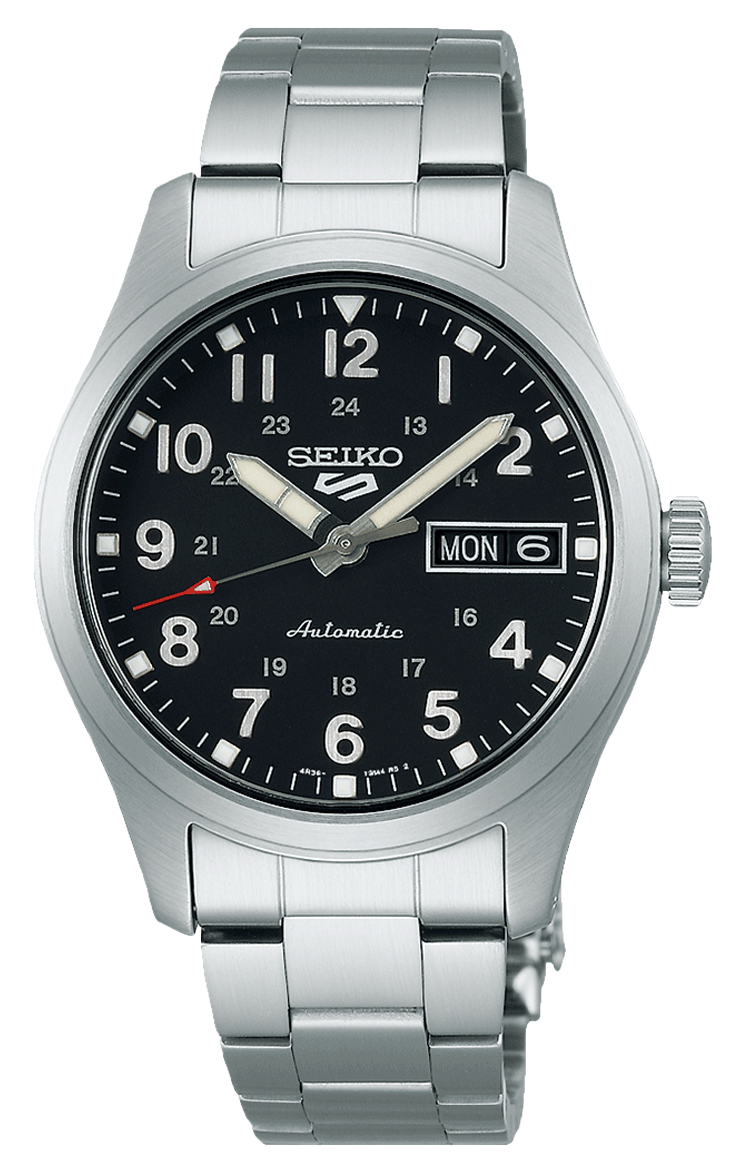 A Seiko 5 Sports “field” modellek az órák világában egy külön kategóriát képviselnek, a katonai stílus egy kicsit polgárivá szelídített változatai, igen jellegzetes, könnyen felismerhető stílusjegyekkel. A katonai jellegre több jel is utal, az egyik legszembetűnőbb a 12-es index helyén lévő háromszög alakú jelzés, amely a katonai repülés egy szimbóluma, a műszereken a pozíció gyors azonosítását teszi lehetővé. Az arab számos indexek is a gyors és biztos leolvasást segítik, a 12 órás skála mellett pedig helyet kap egy 24 órás, második skála is, amely az angolszász világban szintén csak a katonai területeken használt, a mindennapokban csak a 12 órás skálára van szükség. A 36.4 mm-es átmérőhöz 12.5 mm-es vastagság társul, így a tok arányos és kényelmesen viselhető mind az átmérője, mind a vastagsága, mind az ezekből eredő, a korábbinál kisebb súlya miatt is. A fekete számlapos, fémszíjas SRPJ81K1 kivitele az alapjai közé tartozik az egész kollekciónak, sőt úgy általában a sportos órák világának is. A kontrasztos, könnyen leolvasható számlapon a fehér indexek és mutatók eltéveszthetetlenek, a másodpercmutató piros, nyílhegy formájú vége pedig éppen annyi színt visz a megjelenésébe, amitől egy kissé izgalmasabb lesz. A modellt 4R36 kaliberrel alkották meg, amely 24 köves, kézi felhúzóval, 41 órás járástartalékkal rendelkezik. Ez a karóra automata szerkezettel szerelt, amely a kéz mozgásából származó mozgási energiát alakítják át a működéshez szükséges energiává úgy, hogy a szerkezetben található súly körkörös mozgása során a rugó felhúzásra kerül.