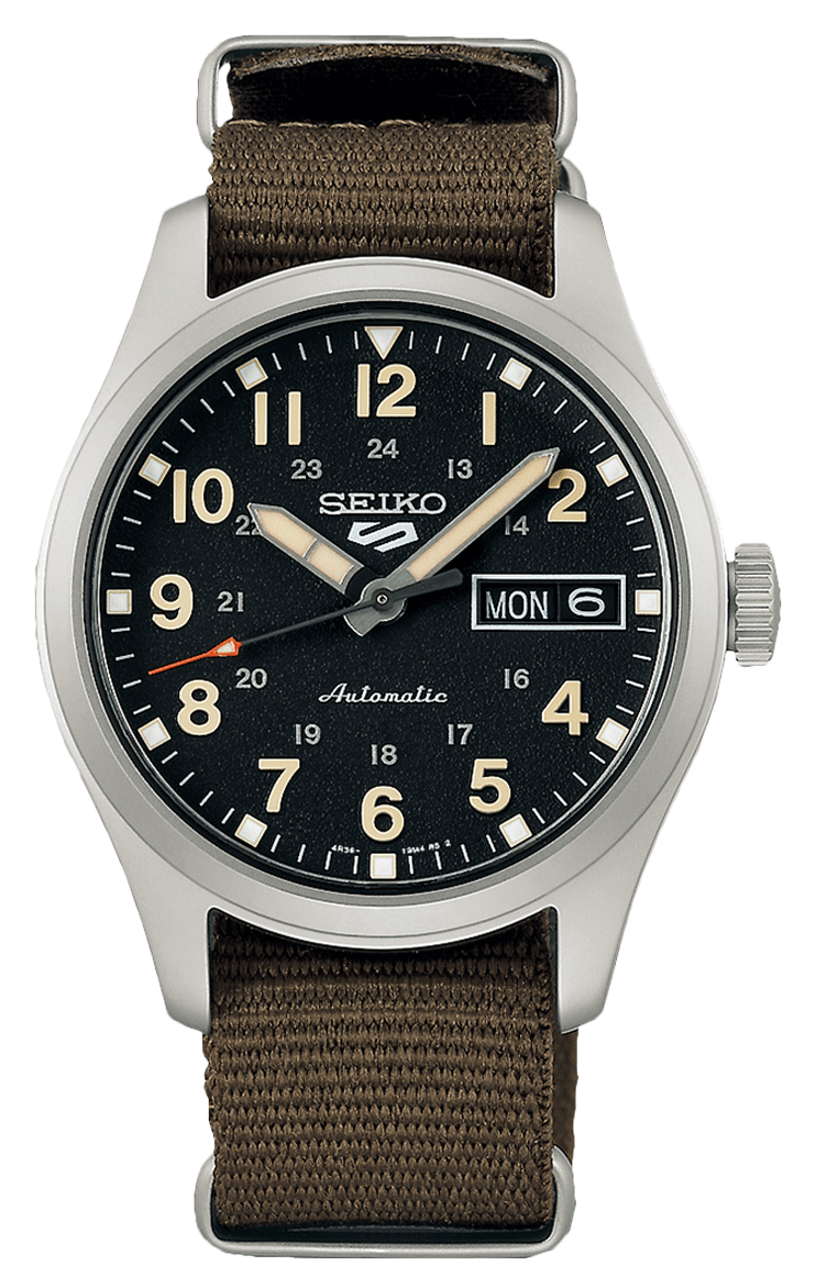 A Seiko 5 Sports “field” modellek az órák világában egy külön kategóriát képviselnek, a katonai stílus egy kicsit polgárivá szelídített változatai, igen jellegzetes, könnyen felismerhető stílusjegyekkel. A katonai jellegre több jel is utal, az egyik legszembetűnőbb a 12-es index helyén lévő háromszög alakú jelzés, amely a katonai repülés egy szimbóluma, a műszereken a pozíció gyors azonosítását teszi lehetővé. Az arab számos indexek is a gyors és biztos leolvasást segítik, a 12 órás skála mellett pedig helyet kap egy 24 órás, második skála is, amely az angolszász világban szintén csak a katonai területeken használt, a mindennapokban csak a 12 órás skálára van szükség. A 36.4 mm-es átmérőhöz 12.5 mm-es vastagság társul, így a tok arányos és kényelmesen viselhető mind az átmérője, mind a vastagsága, mind az ezekből eredő, a korábbinál kisebb súlya miatt is .Az SRPJ85K1 modell egy kissé vintage hangulatú pilóta órát idéz fel. A fekete számlapon a halvány bézs színű mutatók és számjegyek egy megfakult, sokat látott órát juttatnak a szemlélője eszébe, a barna textil szíj pedig csak erősíti ezt az érzést – vintage hangulat és mai technika, a tökéletes párosítás. A modellt 4R36 kaliberrel alkották meg, amely 24 köves, kézi felhúzóval, 41 órás járástartalékkal rendelkezik. Ez a karóra automata szerkezettel szerelt, amely a kéz mozgásából származó mozgási energiát alakítják át a működéshez szükséges energiává úgy, hogy a szerkezetben található súly körkörös mozgása során a rugó felhúzásra kerül.
