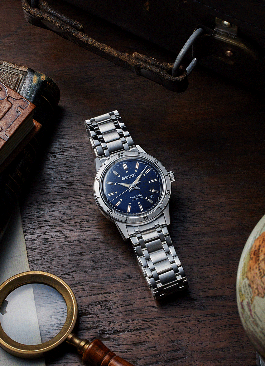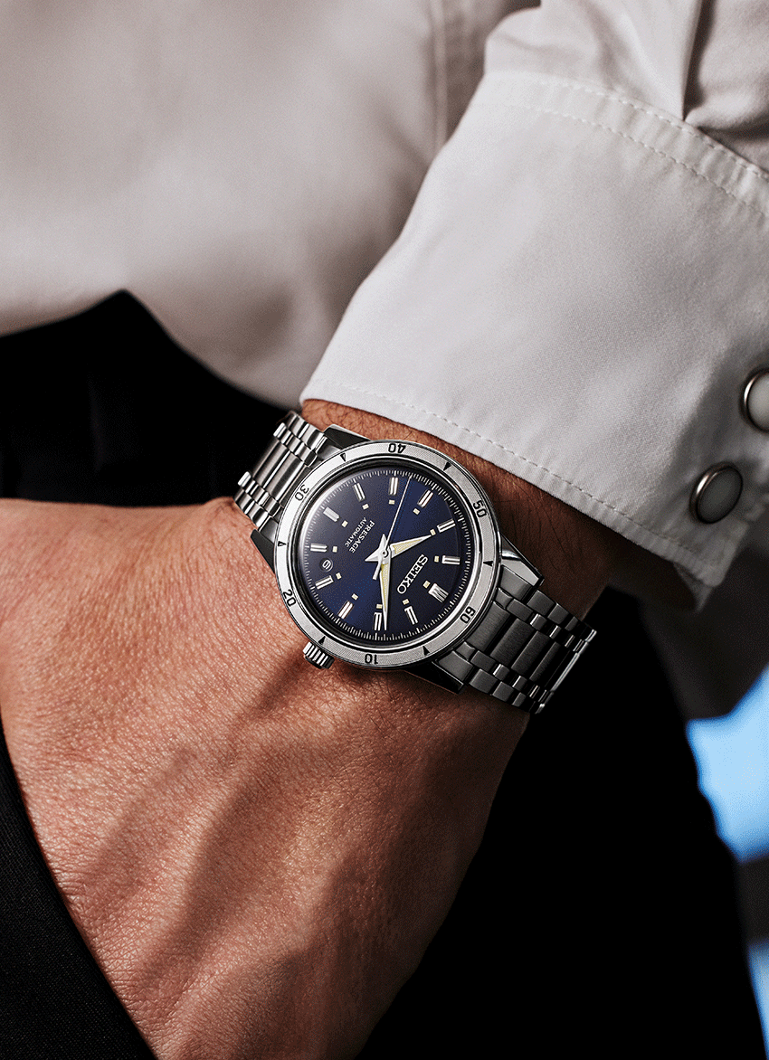 A Presage Style 60’s sorozata azokat a hatvanas éveket idézi fel, amelyekre sokan oly szívesen gondolunk, ha az óraipar és a Seiko történelméről esik szó. Az SRPL07J1 modell, tengerkék számlapjával jól hozza a sorozatban megismert hangulatot. Úgy lett modernebb, hogy közben mit sem változott a megjelenése, csak a részletek finomodtak, és néhány adat változott. Kisebb lett a tok, a korábbi modellek 40.8 mm-es mérete helyett immár 39.5 mm az átmérője, ez jól illeszkedik az óraiparban évek óta látható óvatos “downsizing” sorba, a korábbi folyamatos méret növekedés helyett most újra fordult a trend, ezúttal a csökkenést látjuk. A számlapon felfedezhetünk egy érdekességet, az eddigi, 3 óránál elhelyezett és fém kerettel ellátott dátumablak helyett a komplikáció 4 és 5 óra közé költözött, a szerkezet azonban változatlanul a jól ismert 4R35 mechanikus automata kaliber.