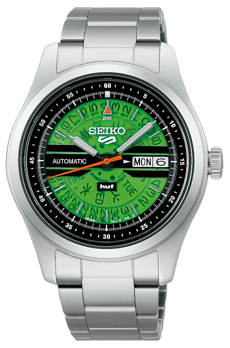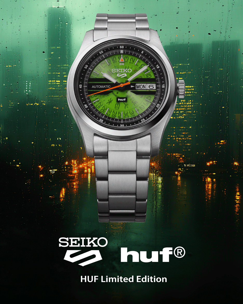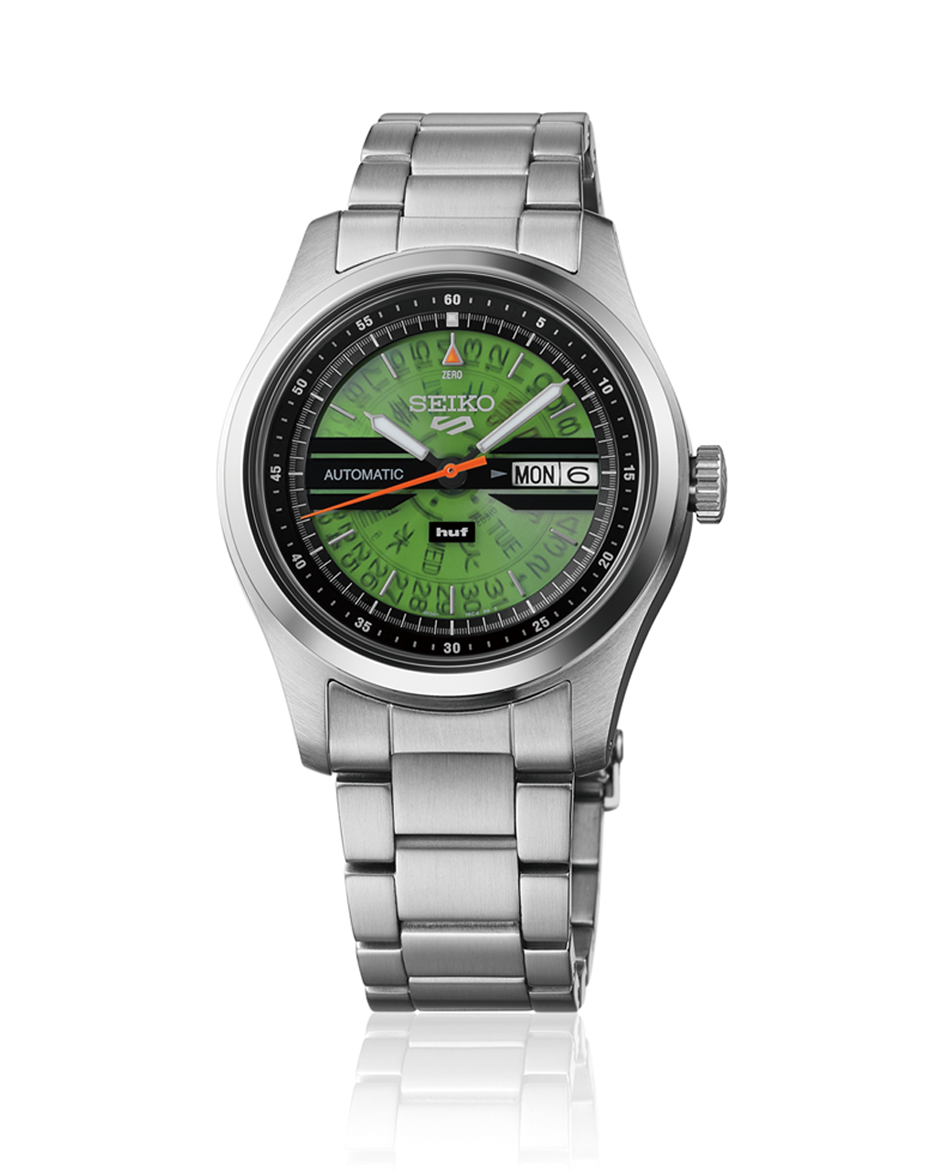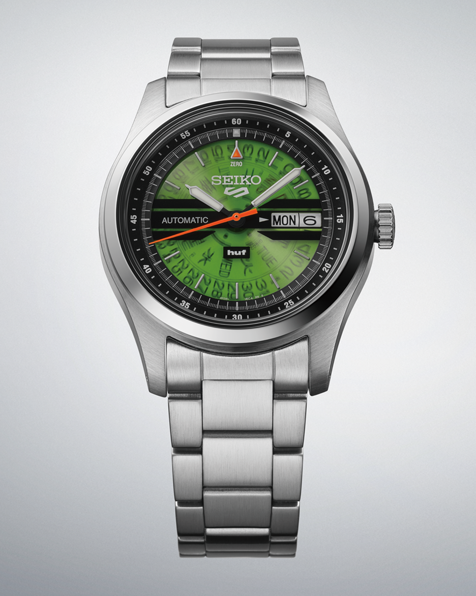 A Seiko 5 Sports SRPM09K1 egy különleges, HUF együttműködésben készült, 7000 darabra limitált kiadás, amely a hetvenes évek egyik jellegzetes Seiko modelljének hangulatát idézi meg modern, streetwear ihletésű köntösben. A modell karakterét a félig áttetsző, HUF Green árnyalatú számlap adja, amely játékosan enged betekintést a szerkezet világába, miközben a 6 óránál elhelyezett „huf” logó teszi igazán egyedivé az összképet.A kompakt, 39,4 mm-es nemesacél tok kényelmes viseletet biztosít a mindennapokban. Az órában a megbízható Seiko 4R36 automata szerkezet dolgozik, amely kézi felhúzási lehetőséggel és körülbelül 41 órás járástartalékkal rendelkezik. A nap- és dátumkijelzés praktikus kiegészítője a mindennapi használatnak, míg a LumiBrite bevonattal ellátott mutatók és indexek sötétben is jól leolvashatóvá teszik az időt. A hátlap üvegbetétes, HUF Green színnel és San Francisco ihlette grafikával díszített, emellett LIMITED EDITION felirat és egyedi sorszám gravírozás jelzi az exkluzivitását. A különkiadás speciális dobozban érkezik, és egy egyedi óratörlő kendő is jár hozzá.